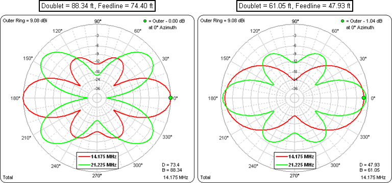 Here's what the radiation patterns look like. These are azimuth slices at an arbitrary take-off angle of 20 degrees. Red is for the middle of 20m and green is for the middle of 15m.