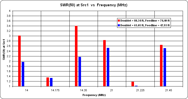 With those two sets of antenna and feedline lengths I set up a series of test cases. Each of the two "B" and "D" combinations was run against 3 frequencies in the 20m band and 3 frequencies in the 15m band.