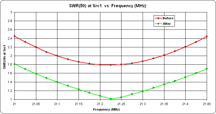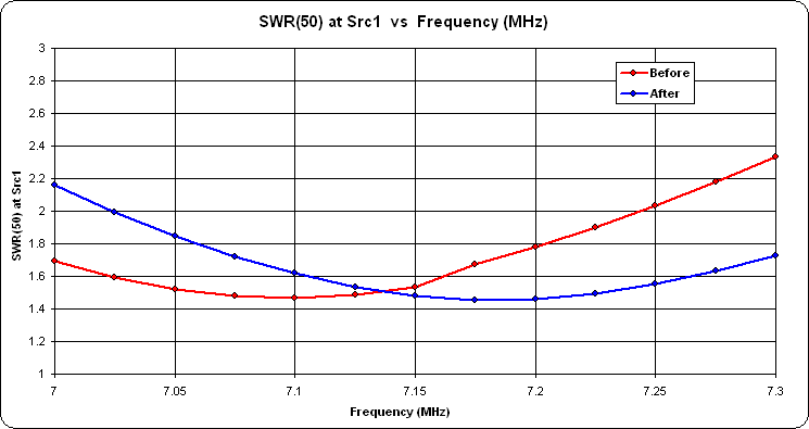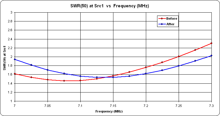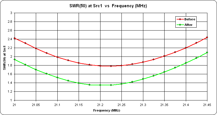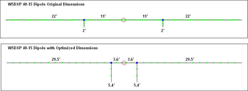 The lengths of the eight hat wires (four on each side) were then adjusted to get the best match on 15m, leaving the position of each hat at 1/3 out from the center as "the books" suggest. That's the "Before" model. Then I used the AutoEZ optimizer to adjust the position of the hats, the size of the hats, and the overall length of the main wire, to get the best match on both 15m and 40m. That's the "After" model.