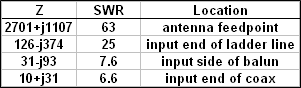Including all the components of the antenna system in the model definitely makes a difference. For example, at a frequency of 21.225 MHz (center of 15m) here's how the impedance and SWR values change as you "work backwards" from the antenna to the station.
