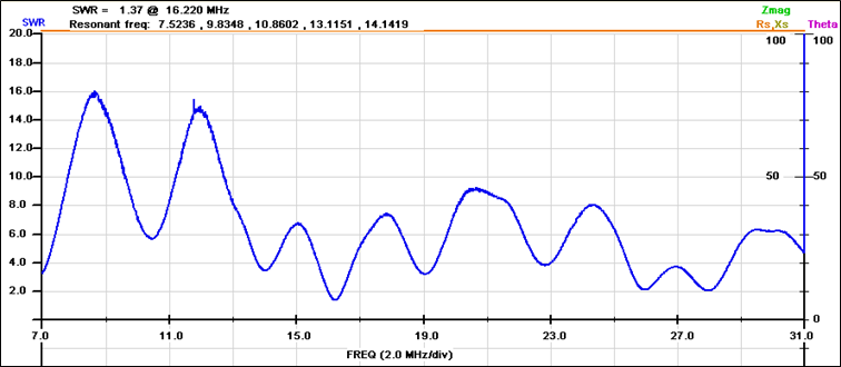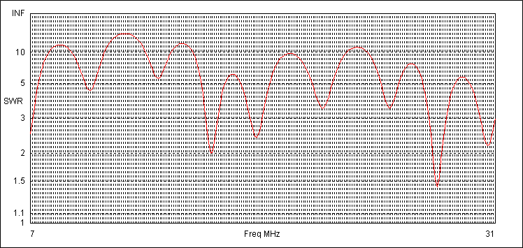Because the source is at V1, when you run an SWR sweep the results will be as seen at the input (shack) end of the 8 ft of coax. Here's a sweep from 7 to 31 MHz. Note that the trace line is normally black. I changed it to red for this discussion.