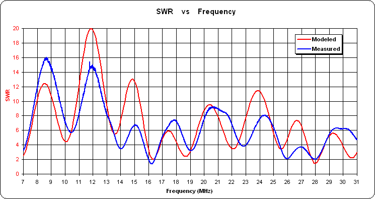 Looking at that chart it's clear that the modeled and measured results are at least in the same ballpark. If the antenna wire length and height are correct, the biggest unknown in the model is the ladder line. You could vary the modeled ladder line length, Zo, and/or VF, run a new SWR sweep, then load that new sweep data into Zplots to compare to the AIM measurements, tweaking things to try to get a better correlation. It would probably be easier to place a known load at the far end of the line, such as a 100 ohm resistor, model that with EZNEC, measure it with the AIM, and then adjust the ladder line characteristics until the two traces matched. But that's a discussion for another time.