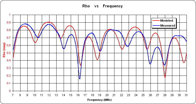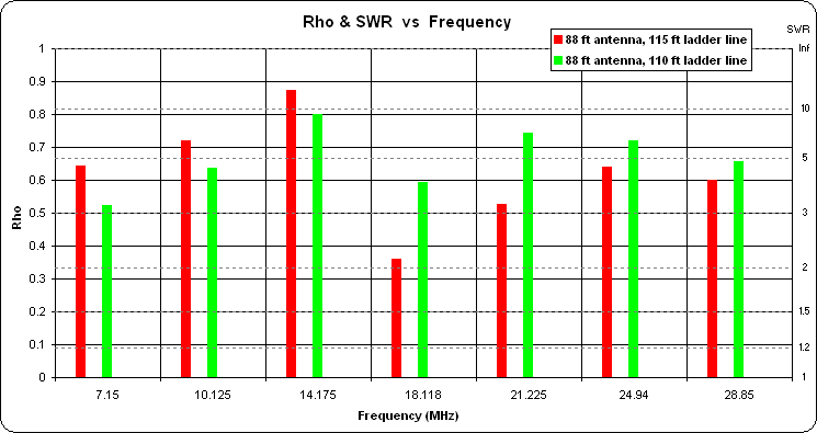 Besides numerical results AutoEZ also has several chart options that make "what if" comparisons easy. In this chart the green bars are with the original specs and the red bars are with the ladder line 5 ft longer. The chart shows both rho (left scale, solid gridlines) and equivalent SWR (right scale, dashed gridlines).