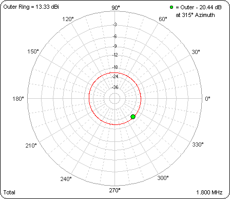 Then I redid the calculations, this time requesting azimuth plots at an arbitrary 20 degrees TOA. For this particular TOA the max gain was 13.33 dBi at 21 MHz. The outer ring is again frozen at that value to allow relative strength comparisons. Here's the movie for that.