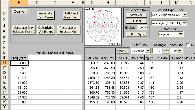 Then I set up and ran a series of AutoEZ test cases. This is a portion of the AutoEZ 'Calculate' sheet tab. Elevation plots are being requested. Note that the max gain, 7.87 dBi, happens at 18.1 MHz, at least for the 0 degrees azimuth angle at which the elevation plots were calculated.