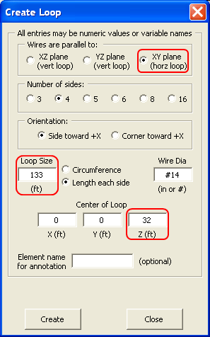 First I used this AutoEZ dialog to quickly create all four wires of the loop. Note that each side is 133 ft and the center is 32 ft above ground. Then just one click on the “Create” button does all the work.