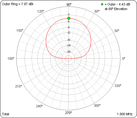 After the calculations are done (only takes a few seconds) you can tab to the Patterns sheet and "watch the movie" of how the elevation pattern changes at each frequency. You can also create an animated gif of the patterns by using a combination of AutoEZ features and an external "Animated GIF Maker" program. Here's the animation. Note that the outer ring has been frozen at 7.87 dBi which allows for easy comparison of relative pattern strength as well as shape. Frequency is shown in the lower-right corner.