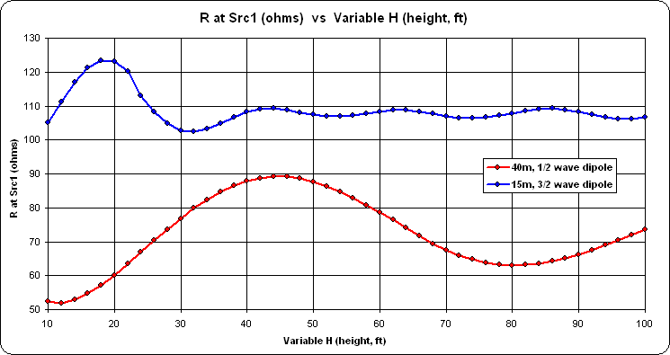 In a follow-up to the previous example of using the same wire as a 1/2 wave dipole on 40m and a 3/2 wave dipole on 15m, G3TXQ said "A 3/2 wave centre-fed has an impedance oscillating around 110 Ohms depending on height."