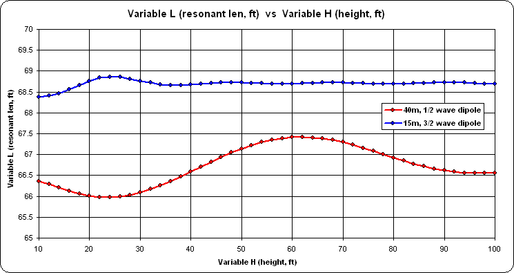 Using AutoEZ I modeled a 1/2 wave dipole for 7.15 MHz at various heights from 10 to 100 ft. For each step up in height I let the Resonate on Selected Cell button determine the exact length required for resonance (that is, X=0). In this screen grab variable "H" (column C) is the height and variable "L" (column D) is the length after being resonated.
