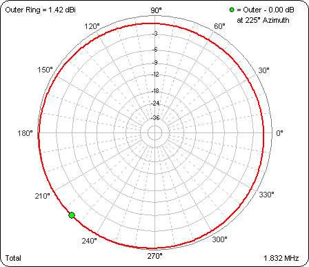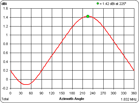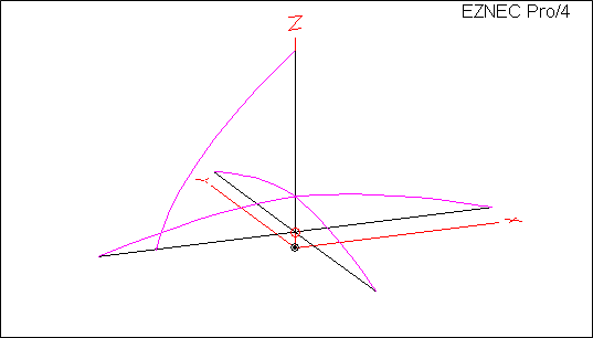 You can use this one model to study what happens when you change the height of the radials, the length of the radials, the length of the vertical section, and/or the length of the horizontal section. The horizontal section length may be set to zero in which case the model becomes a simple vertical. In the view above the radials are 130 ft (~87°), the vertical section is an arbitrary 65 ft, and the horizontal section has been set to ~71.9 ft using the Resonate button. Test frequency is 1.832 MHz. The AutoEZ model can be downloaded (right click and select Save As) here.