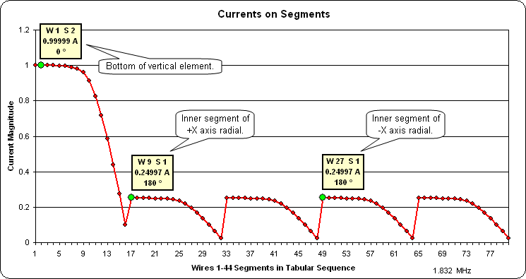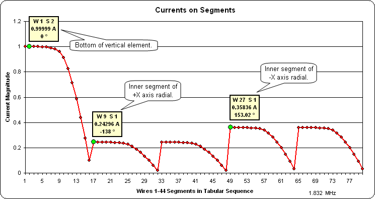 Note that in the above chart the "shapes" of the curves do not match what is shown in the EZNEC view. That's because in this particular model the segments do not have a uniform length. However, the magnitude/phase results are as expected; 1 amp at the source (Wire 1 Segment 2 [W1 S2]) and 0.25 amps at the inner end of each radial (such as Wire 9 Segment 1 [W9 S1]).