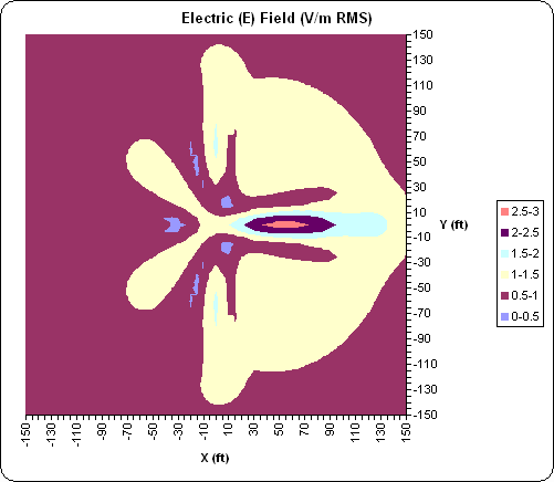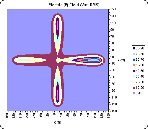 And here's the E-fld at 1 ft below ground. This is not an apples-to-apples comparison; note the range of the scale is greatly reduced. (NEC4 engine required to produce this view.)
