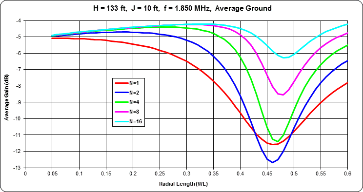 V: Angle of top wire(s), down from horizontalAs mentioned, one use of this model is to recreate the N6LF charts under different conditions. For example, here is Fig 12 from Part 1 of the article. In this case Average Gain is being used as a proxy for antenna efficiency. The length of the radials is swept from 0.05 λ to 0.6 λ and the chart shows a large drop in Average Gain as the radial length approaches 0.45 λ, less so when more radials are used.