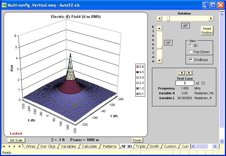 An alternate way of showing what is happening, not possible with a print publication, is to animate the E-field pattern as the length of the radials is increased. Here is the case for N=4 with the radial lengths ranging from L=0.05 λ to L=0.6 λ, the same range as the previous chart. Temporary variable "A" is being used to set the radial length in wavelength units which is then converted to the actual "L" in feet. Values for both A and L may be seen to the right of the chart. E-field was calculated at 1 foot below ground. With most browsers, press Esc to stop the animation in order to take a closer look at any frame, press F5 to restart.