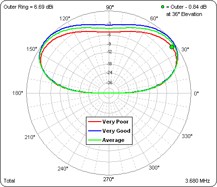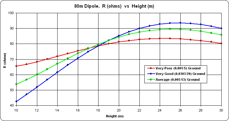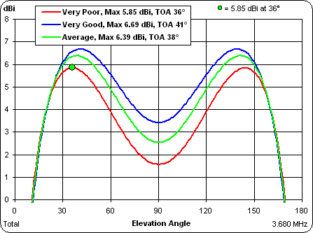 A follow-up question was asked about how the different ground conditions affect the takeoff angle (TOA) at 30m. Even at a height of 30m the elevation pattern for an 80m dipole is still very broad. This is the pattern for the three different grounds.