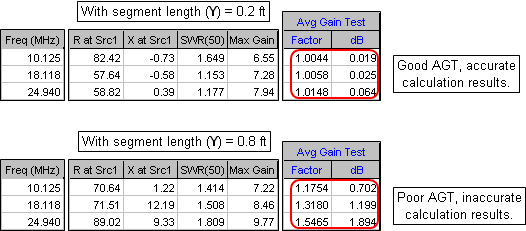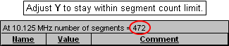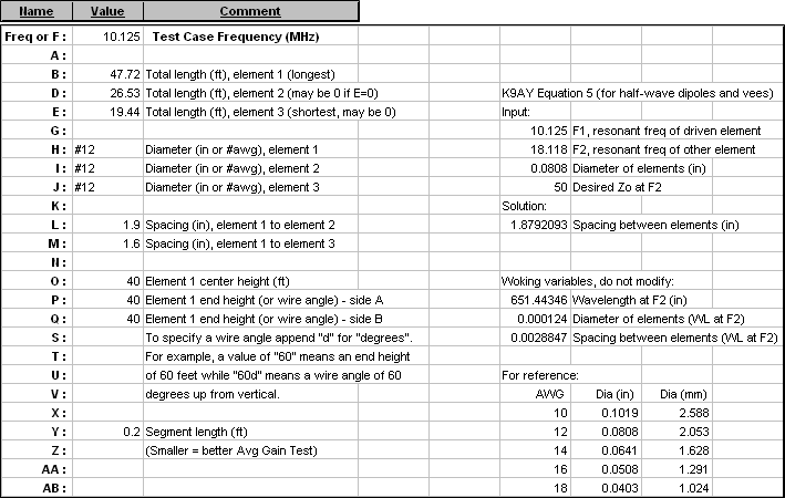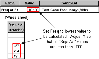 Second, keep in mind the NEC modeling guideline that the segmentation density must be less than 1000 segments per wavelength. To check that, first set the frequency (cell C11) to the lowest value you intend to calculate. That will probably be the lower end of the lowest design band. Then tab to the Wires sheet and make sure that none of the values in the For Information Only "Segs/wl" column (column N) exceed 1000. If any "Segs/wl" values are greater than 1000 make Y larger.