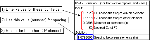 For the element lengths K9AY suggests 477/Freq (in feet) rather than the normal 468/Freq. For spacings you can use the K9AY Eq 5, shown below.