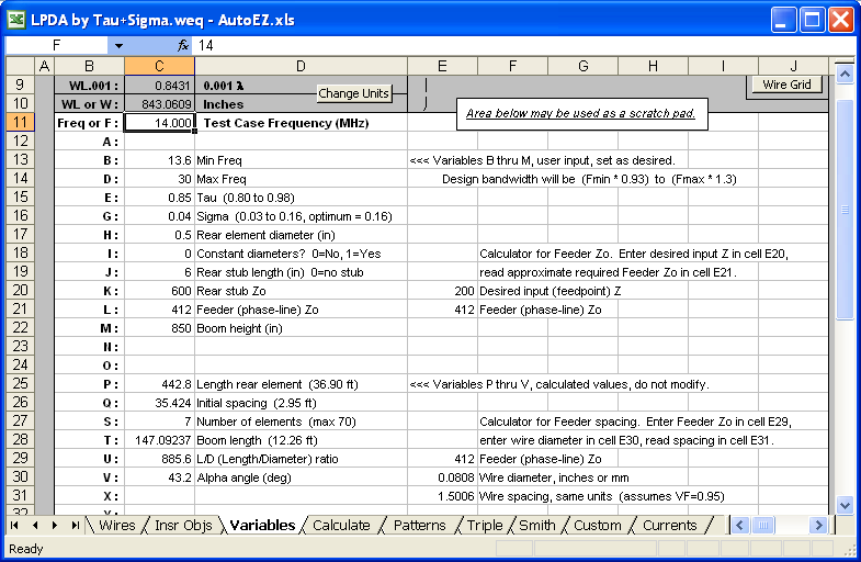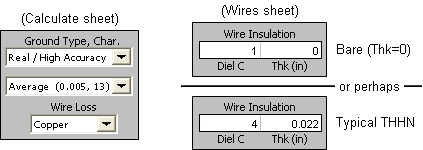 In addition to setting variable values, also make sure that the ground characteristics and wire loss (on the Calculate sheet) and the wire insulation (on the Wires sheet) are all set as desired. For bare (uninsulated) wires use a thickness of 0; dielectric constant is ignored in that case. Insulation values for typical THHN wire were provided by WX7G, thanks!