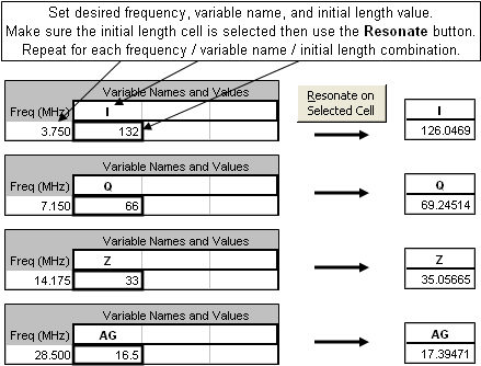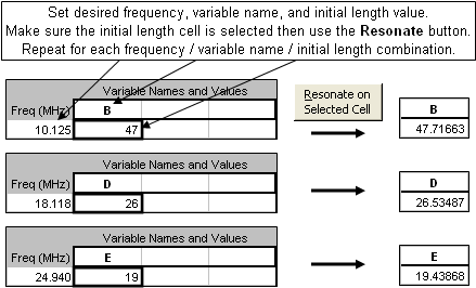 Once you have the model configured as desired the next step is to fine-tune the element lengths to be resonant at your chosen set of frequencies. On the Calculate sheet enter a frequency, the variable name that controls the length of the corresponding element, and a starting length value. With the length cell selected click the Resonate button. Repeat this process for other frequencies, variable names, and lengths.