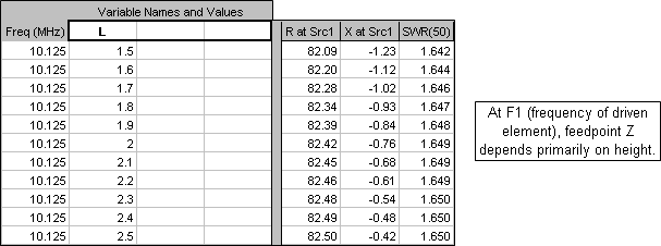 You may wish to also fine-tune the element spacings by running a "variable sweep" set of calculations. For example, variable L controls the spacing between element 1 and element 2. At the main dipole (element 1) frequency the resistive component of the feedpoint impedance depends mostly on the antenna height above ground; the spacing will have very little effect. (The reactive component depends mostly on the wire length.)