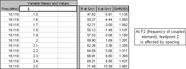 However, at the coupled-resonator frequency (18.118 MHz in this example), different spacings will have a large impact on the resistive component of the feedpoint impedance. And notice that the Eq 5 calculated value (~1.9 inches in this example) is merely a good first estimate to get a 50 ohm resistive component. In this example a spacing of 1.6 inches would be better. (And again, the reactive component can be adjusted by changing the wire length.)