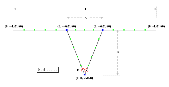 The delta match is discussed in all editions of The ARRL Antenna Book, see "Delta match" in the book index. To duplicate the scenario shown in the book, create a dipole made from three wires such that the overall length is L with an adjustable center section of length A. Then add two additional wires for the delta match, dropping down for a distance of B. If the dipole is 50 feet above ground the (X,Y,Z) coordinates for the various wire ends would be as follows, assuming the antenna lies in the YZ plane. (For convenience, links to sample AutoEZ format models are included below.)