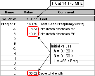 To match an HF dipole to 600-ohm open wire transmission line the Antenna Book suggests a value of 0.120 λ for A and 0.150 λ for B. On the Variables sheet give A and B these initial values (converted to feet) and give L an initial value of 468/Freq.