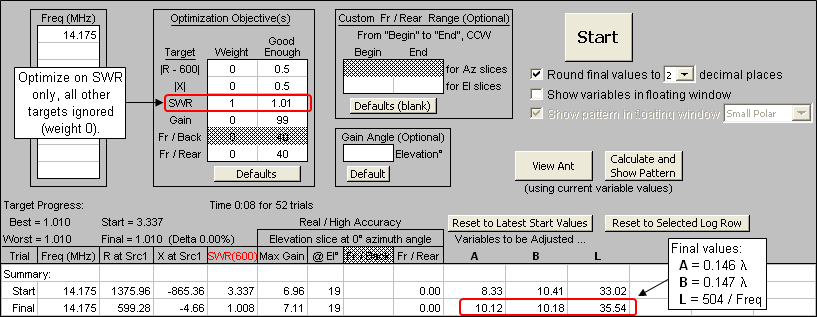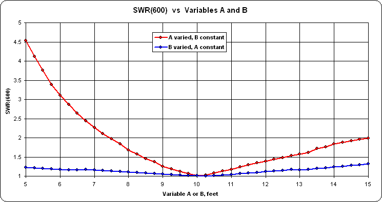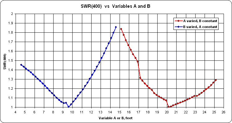 You may also wish to run "variable sweeps" on A and B to study the sensitivity of small changes in each. Below are the results of varying A from 5 to 15 ft while B is held constant at the optimized final value, then varying B while A is held constant, in both cases at a frequency of 14.175 MHz. (Note the different range for the SWR scale compared to the previous chart.)