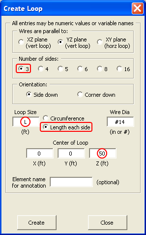 Here's another example, this time for a triangular loop with the center at 50 feet, to be matched to 400 ohms which is the approximate Zo for commercial "450 ohm" window line. Start by using the "Create Loop" dialog to quickly build the three wires of the loop, specifying L as the length for each side. AutoEZ will create the necessary (X,Y,Z) coordinates such that the center of the loop will stay at 50 feet as L is varied.
