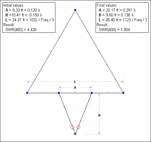 As with the dipole, modify one of the sides to include a center section of length A. Add two additional wires for the delta match. Use the SWR Zo button to set the SWR reference impedance to 400 ohms.