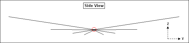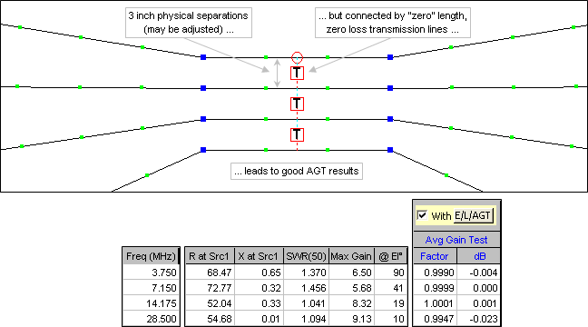 In both the "Splayed" and "Parallel" fan models the elements are physically separated by a small amount at the centers but are electrically joined by "zero" length (almost) and zero loss NEC transmission lines. This technique was described by L.B. Cebik, W4RNL (SK), see reference below. Making the connection between elements this way, as opposed to building a model with the elements physically connected to a common center wire, results in much better Average Gain Test results, hence more reliable impedance and gain values. As an example, using an exploded view of the splayed element model shown earlier: