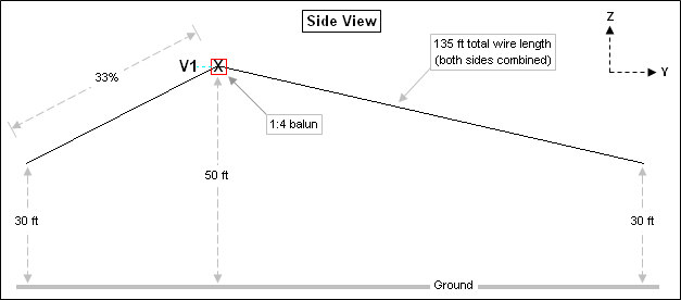 With model "OCF Dipole.weq" you can use variables to set the total wire length and the percent from end for the feedpoint position. As with the fan models you can control the slope angle of both the short and long sections by specifying either end heights or wire angles. An additional variable lets you change the impedance ratio of the balun at the feedpoint, such as 1:4 or 1:6. Here is an example of a typical layout.
