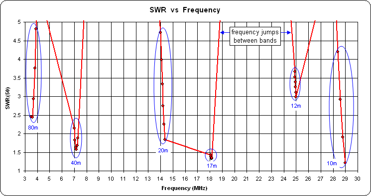 And here is the SWR response for this particular configuration. Six frequencies were used for each of 8 bands, 80/40/30/20/17/15/12/10 meters. Using the same number of frequencies for each band means that you can take advantage of the Subsets button on the Custom chart tab to see the response for each band separately (discussed more later), although the illustration below shows all bands together. In this example the max SWR was clipped at 5:1 for plotting so some bands don't show all 6 frequency dots and other bands don't show any dots at all. The straight trace lines connecting groups of dots are merely the "frequency jumps" from one band to the next and can be ignored.
