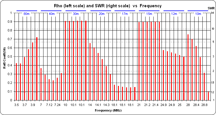 "Frequency - Column" rather than"Frequency - Line" . That eliminates the extraneous straight line traces between the bands. So in the chart below, each band is shown as 6 columns rather than six dots connected by lines. The reflection coefficient (rho) values are on the left vertical scale, the corresponding SWR values are on the right.
