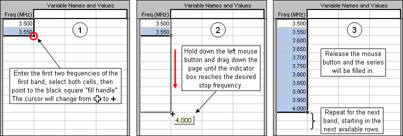 When dealing with multiband antennas there is always the question of which frequencies to calculate. Of course you can use something like Start 3.0, Stop 30.0, Step 0.05 MHz but that results in many frequencies of little interest unless you are trying to get a feel for the relationship between SWR dips. An alternative is to calculate groups of frequencies for each band, skipping the frequencies between bands. The Excel "fill handle" makes it easy to enter such groups, as illustrated below.