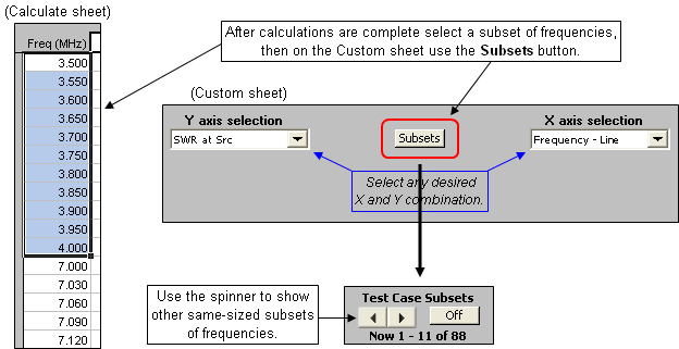 There is an alternate way to show separate bands on the Custom chart if you have calculated the same number of frequencies for each band. After all calculations are complete, on the Calculate sheet select (drag through, highlight) just that subset of frequencies that were used for the first band. Then on the Custom sheet click the Subsets button.