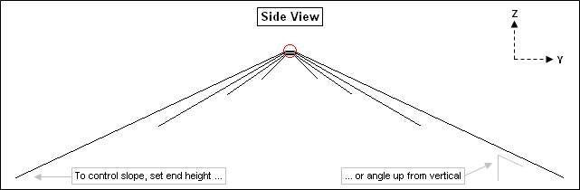 To control the slope (if any) for each side of each element you can set either the height of the outer end or the angle of the wire up from vertical. Whichever you enter will be used along with the total wire length and center height to generate the correct coordinates in the wires table. In addition, the corresponding "other" value (angle or end height) will be shown. The two sides need not have the same slope.