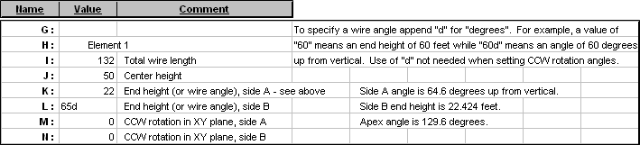 As you change variables be sure to frequently use the View Ant button to verify that the wires of the model are positioned as you intended. Make sure that no wires cross on top of other wires. Also be careful to not enter "impossible" combinations. For example, if an element is 32 ft long (16 ft each side) with a center height of 50 ft, and you set an end height at 20 ft (impossible), you'll see an Excel error code of "#NUM!" for the slope angle.