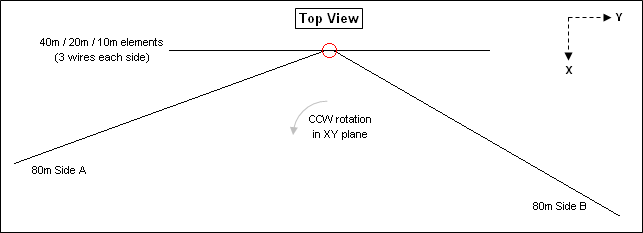 You can also rotate the outer ends of one or more elements in the XY plane, perhaps to increase the separation between wires or take advantage of available supports. Here is a top-down view of a set of inverted vees with the outer ends of the 80m element rotated in a somewhat arbitrary manner, just for illustration. Side A of the 80m element has been rotated 20° CCW in the XY plane and side B has been rotated 330° (or -30°) CCW.