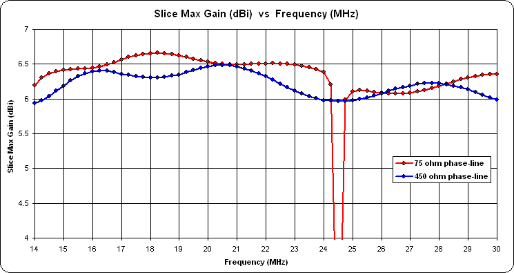 And here's one comparing different phase-line Zo values, both for the same tau/sigma (0.89/0.06). Note the aberration between 24 and 25 MHz when using a 75 ohm phase-line. That spike can be moved to a different position, perhaps to a frequency not to be used, by changing the rear stub.