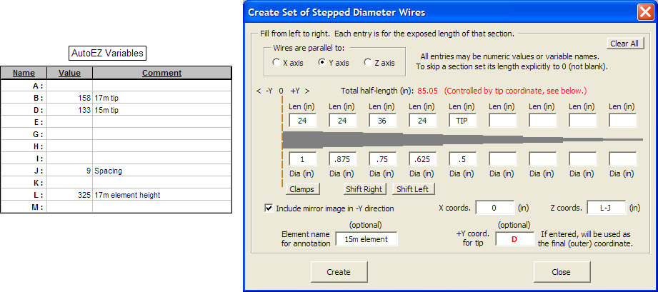 Creating even a simple dipole with stepped diameter wires can be challenging and error-prone. AutoEZ has a tool to automate the process. Here's what the dialog window looks like to create the 15m (lower) element.