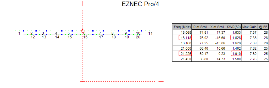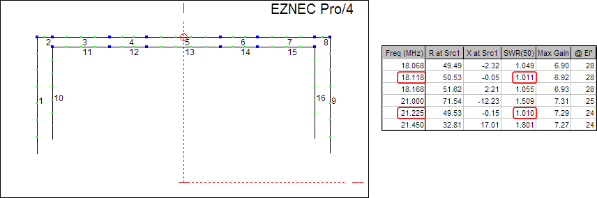 After both elements were created I let the optimizer adjust all the variables except height to get the best SWR at both 18.118 and 21.225 MHz.
