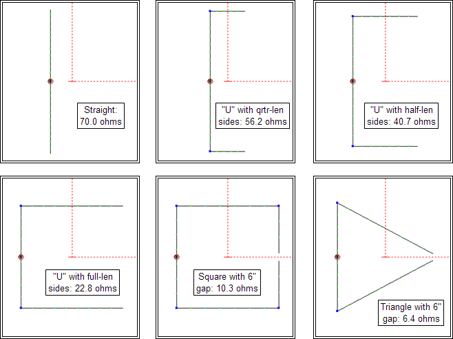Models for each of the above configurations have been created in which all dimensions are controlled via variables. That, along with a little trick involving the optimizer, makes it simple to adjust each element to have an independent feedpoint impedances of either 50+j50 or