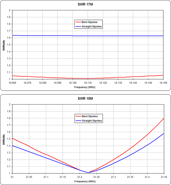 Notice that the best that could be done at 18.118 MHz is SWR ~1.6. That's because the minimum SWR of the driven dipole (the one with the transmission line connected to the center) depends mostly on the height above ground. Also note that this is one of those cases where the length for minimum SWR is not the same as the length for resonance. If the 17m element had been adjusted for resonance (jX=0) at 18.118 MHz the SWR would be 1.79 instead of 1.63.