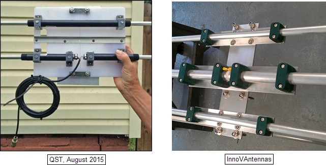As for the physical build, a 10m/6m coupled dipole antenna was mentioned briefly on pg 94 of the August 2015 QST. The picture from that article is shown below. In that version the driven element is on the bottom; in the above models the driven element is on the top. Also shown is the professional version center assembly from Force 12/InnoVAntennas with the driven element in the middle.