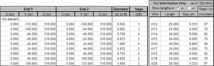 Note that the lengths and diameters of the inner sections match the ARRL taper schedule. The overall half-length is set via variable D and the height is set via a combination of L and J. The initial values for B, D, and J are just estimates. (For the element lengths K9AY suggests 477/Freq (in feet) rather than the normal 468/Freq.) Clicking "Create" generates all the appropriate End 1 and End 2 XYZ coordinates for all the wires that make up the element. In the screen grab below everyplace you see "316.000" is actually an Excel formula "=L-J" and "±133.000" is formula "=D" or "=-D".