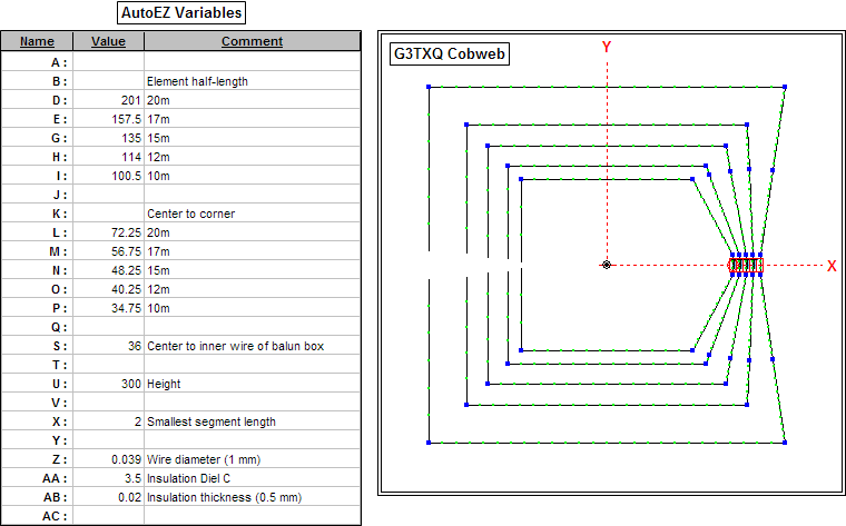 The variables for the element half lengths (D through I), for the center to corner distances (L through P), and for the center to balun box distance (S) are all inter-connected. That is, if you increase D (20m half length) the 20m element tips will move closer to the X axis. If you increase L (20m center to corner) the entire 20m square will get larger and the element tips will move away from the X axis. If you change S (center to balun) the tips will move closer or farther away depending on what it takes to keep D the same.