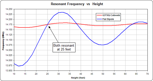 For the dipole, if you trimmed for the correct length when the antenna was only 10 ft off the ground you'd be in for a rude surprise when you raised it to 30 ft. Not so for the cobweb.