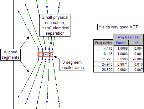 To improve the accuracy of the model I used a trick developed several years ago by LB Cebik. The feedpoints for the elements are physically separated by a small amount at the centers but are electrically joined by "zero" length (almost) and zero loss NEC transmission lines. Making the connection between elements this way, as opposed to having the elements physically connected to a common center wire, results in much better Average Gain Test results, hence more reliable impedance and gain values. For more information on the use of "zero" length transmission lines see here.