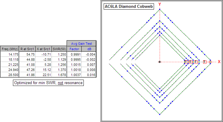 The extra wire junctions (small blue squares near the corners) in the image above are just to keep the segment boundaries aligned for more accurate modeling. In actual construction each half-element is continuous from feedpoint to tip. And note that the element overall lengths (from east side feedpoint to west side tip) were optimized for minimum SWR, not for resonance.